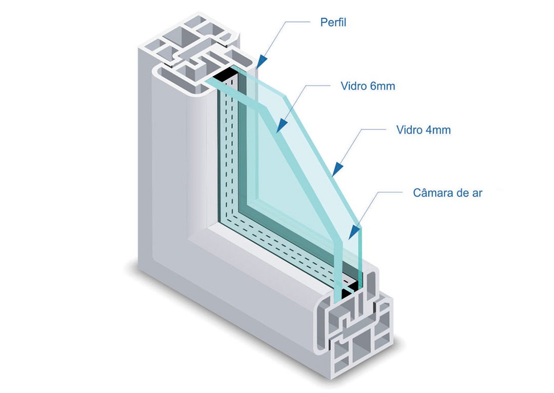 Configuração: 1 Vidro Acústico de 6mm + Câmara de ar (entre os vidros) + 1 Vidro Acústico de 4mm.(total 2 vidros). Uma boa opção de isolamento.