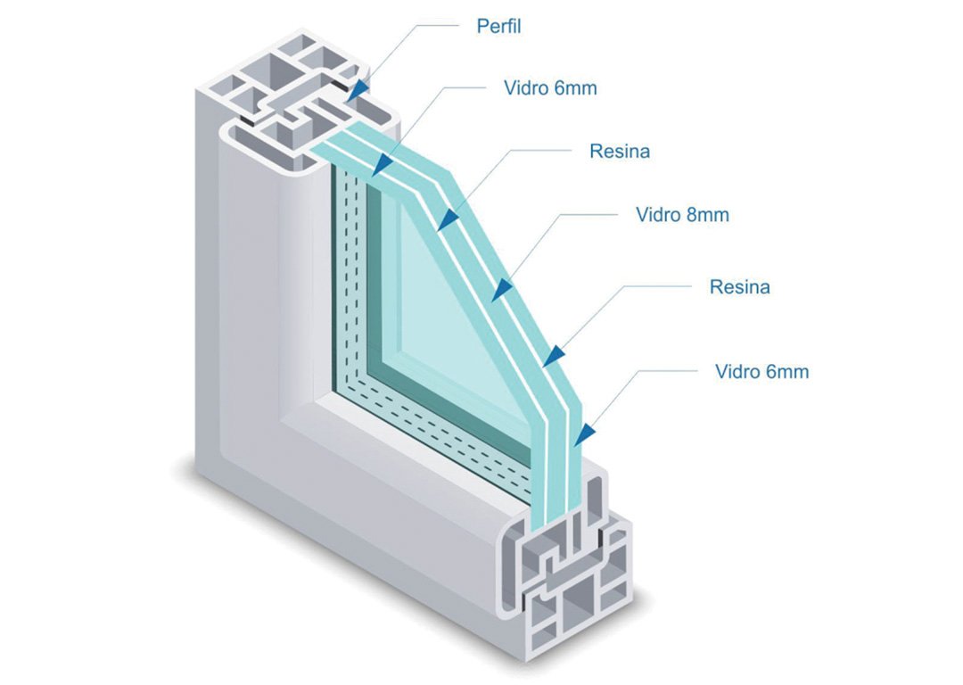 Configuração: 1 Vidro Acústico de 6mm + 1 Resina + 1 Vidro Acústico de 8mm + + 1 Resina + 1 Vidro Acústico de 6mm. (total 3 vidros.