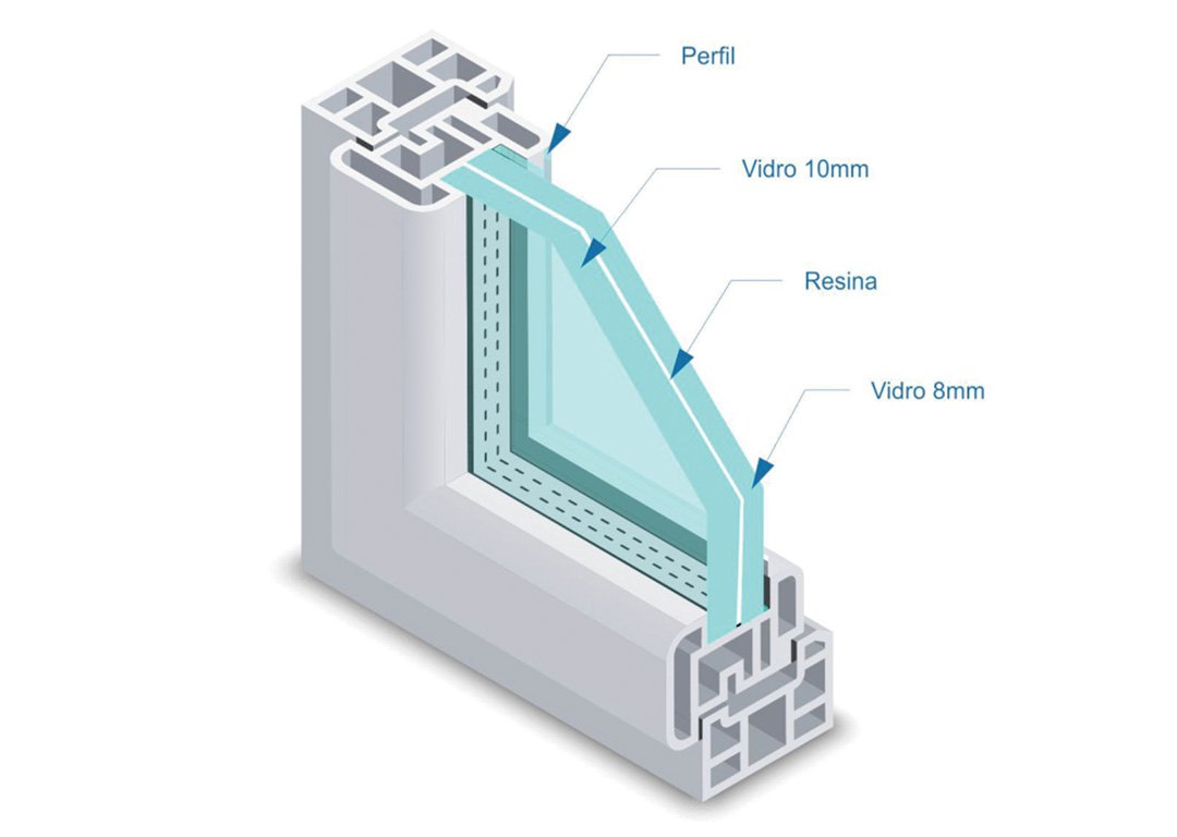 Configuração: 1 Vidro Acústico de 10mm + Apicação de resina + 1 Vidro Acústico de 8mm. (total de 2 vidros) Excelente isolamento acústico.